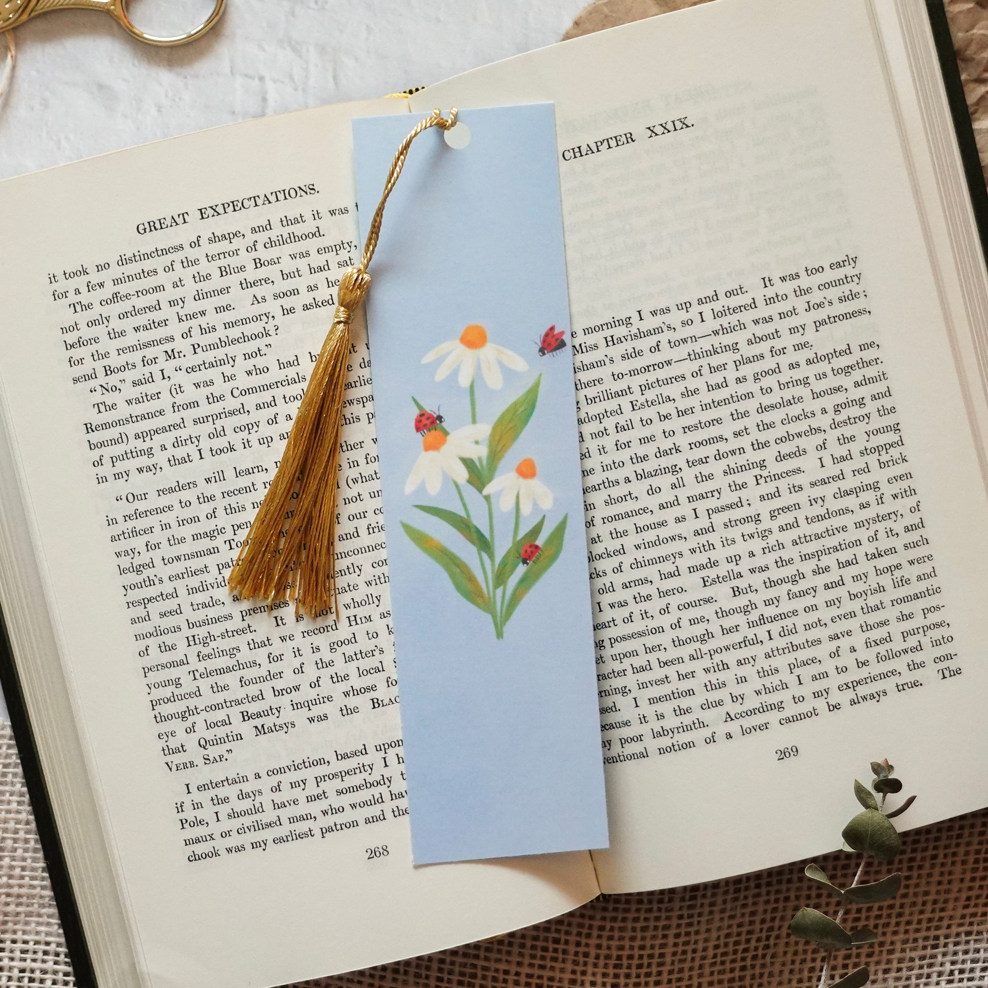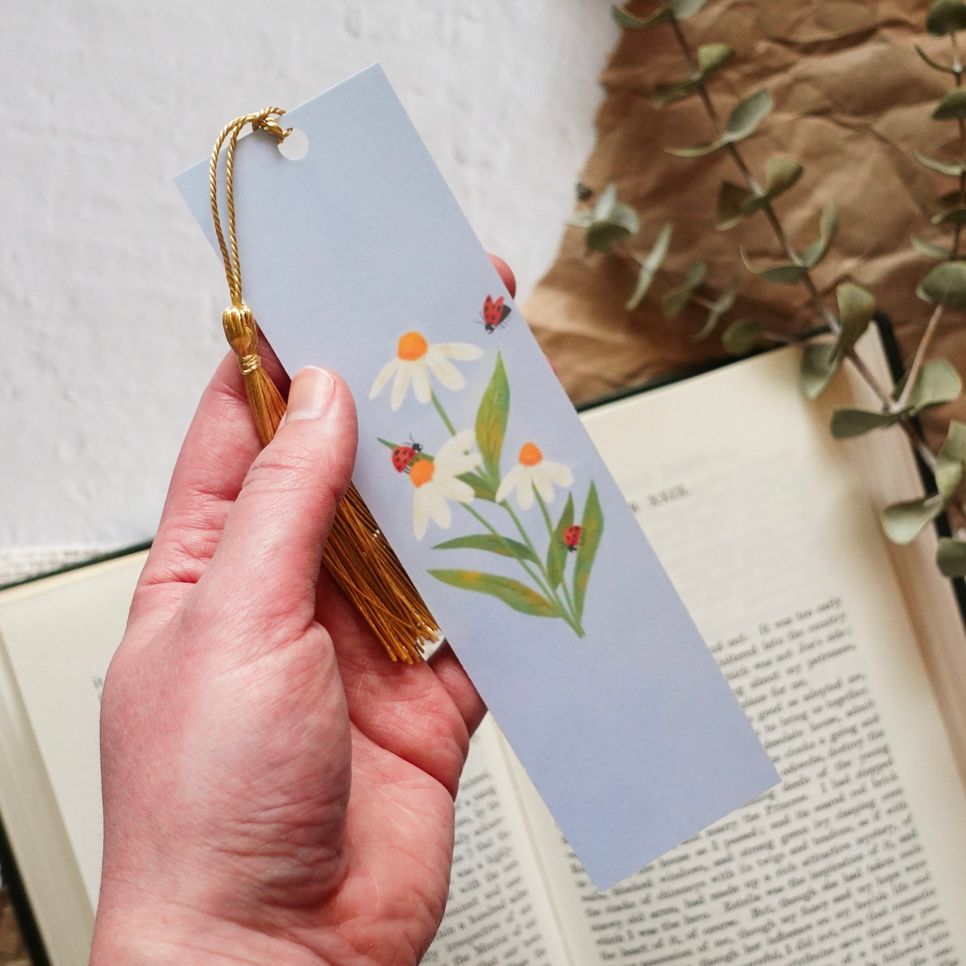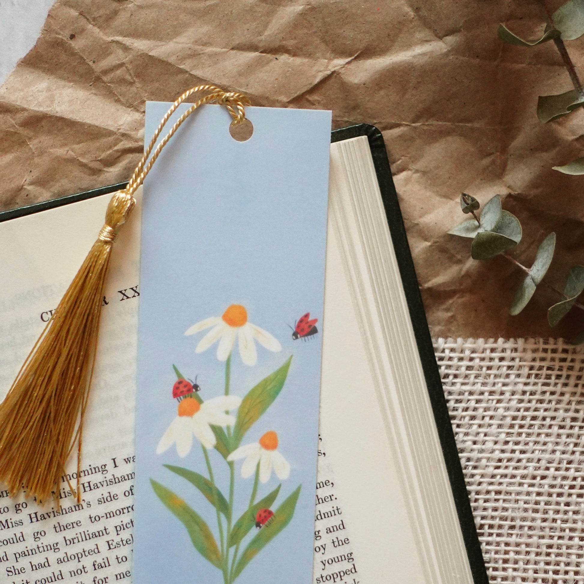 A cottagecore style bookmark with a trio of daisies and ladybugs—a great gift for a nature lover.