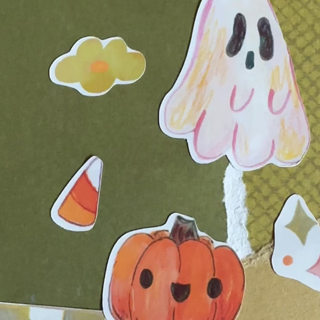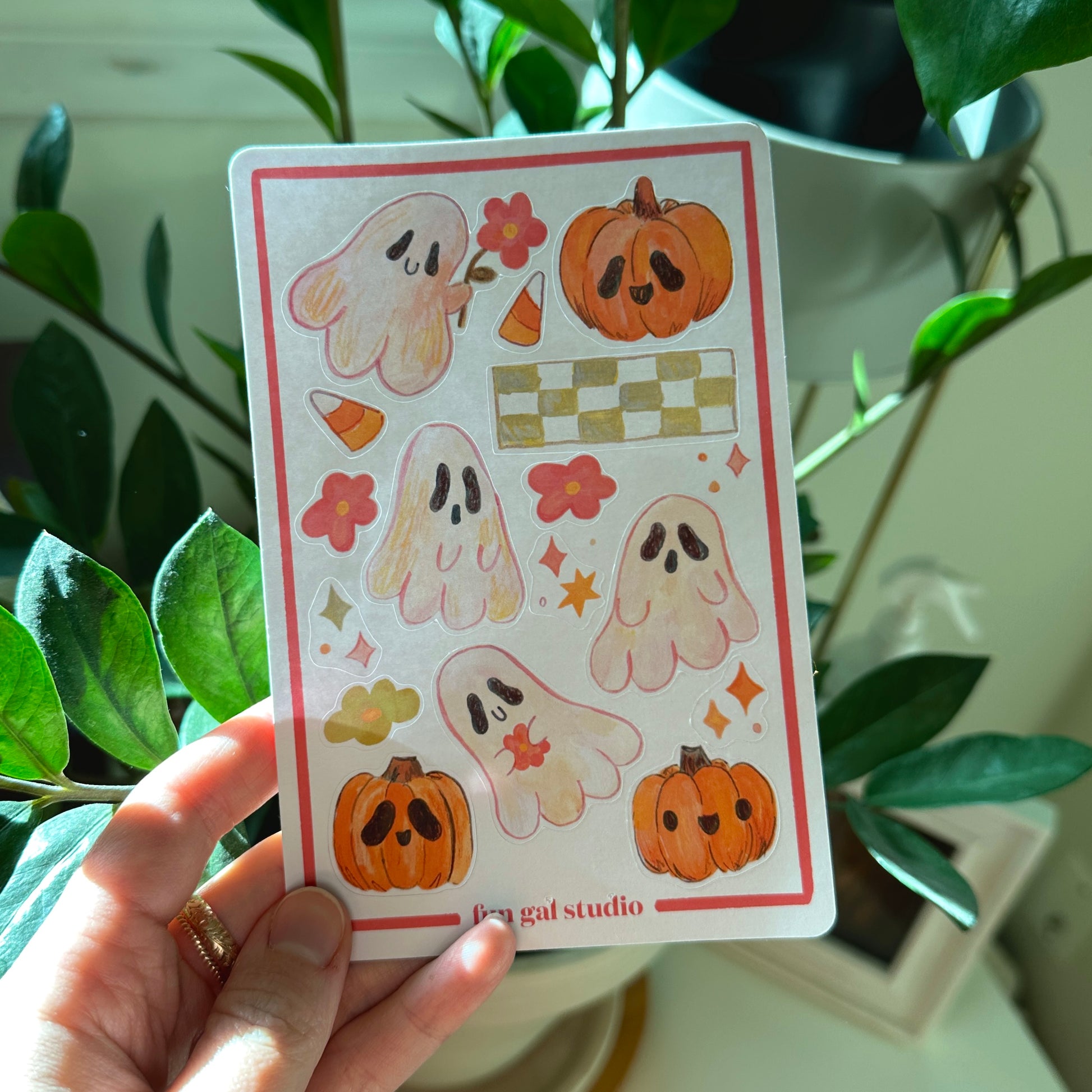 A sheet of 70s-inspired cute ghost and pumpkin stickers adorned with flowers, candy corn, and sparkles!