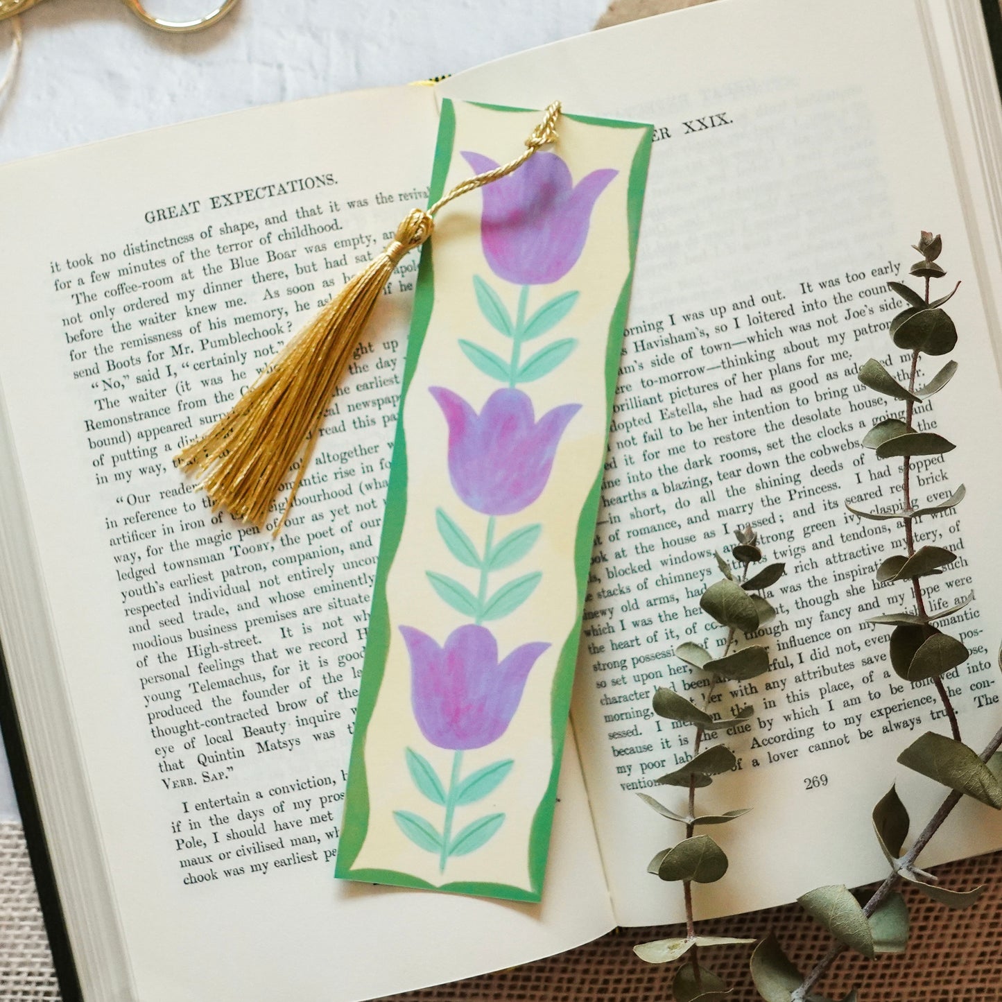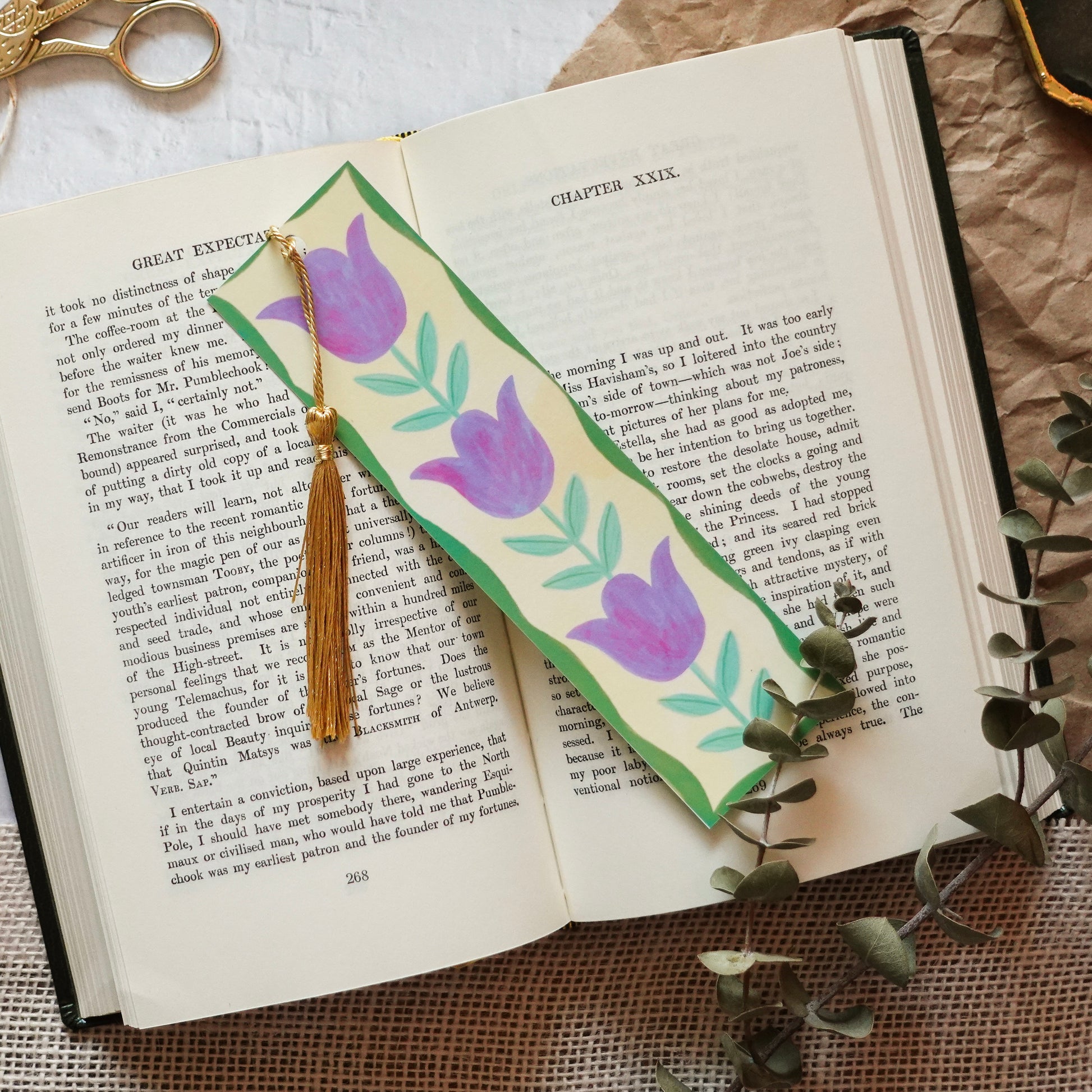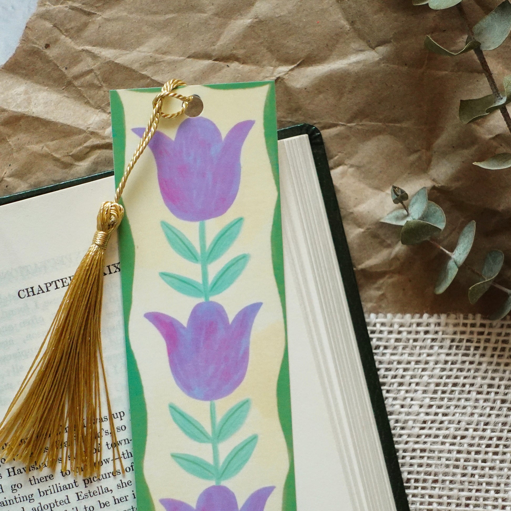 A delicate floral bookmark with a trio of lovely lavender coloured tulips on a soft teal background. A great gift for a flower lover or a gardener.