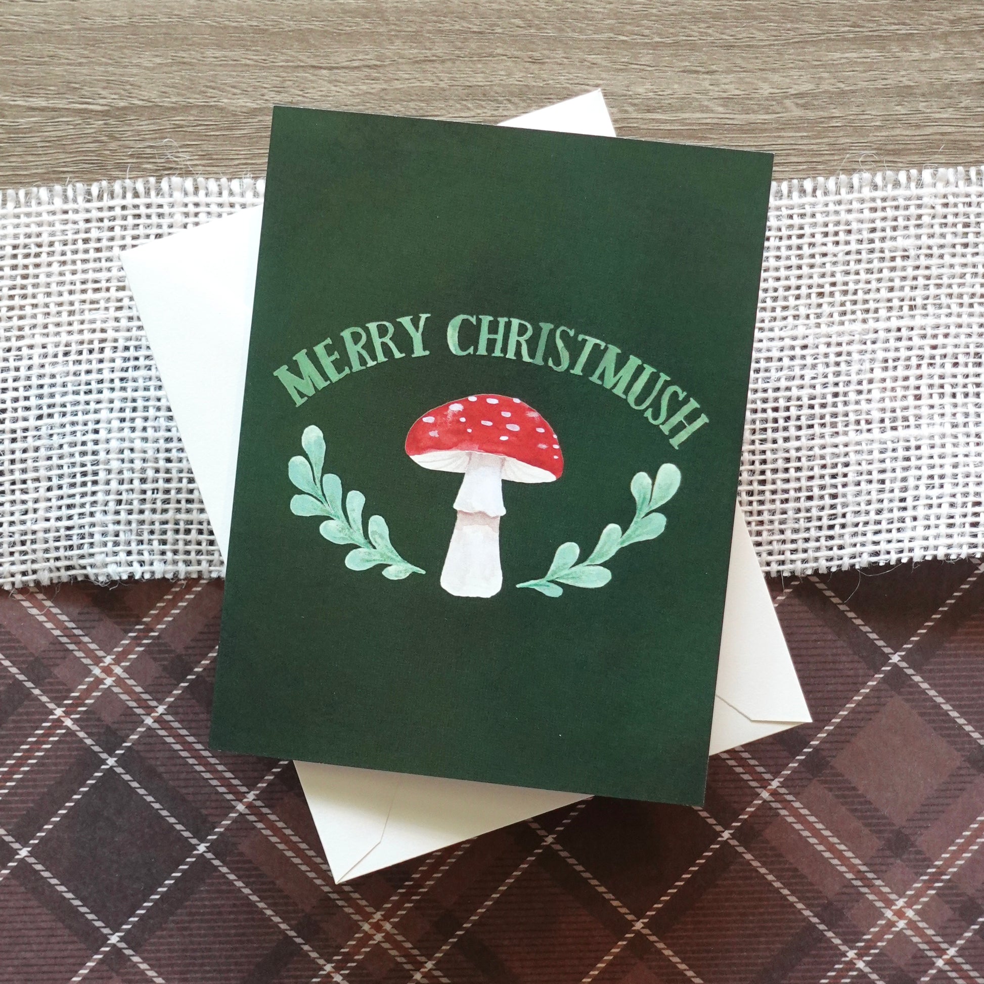 An illustrated card featuring a merry mushroom with a punny holiday message.