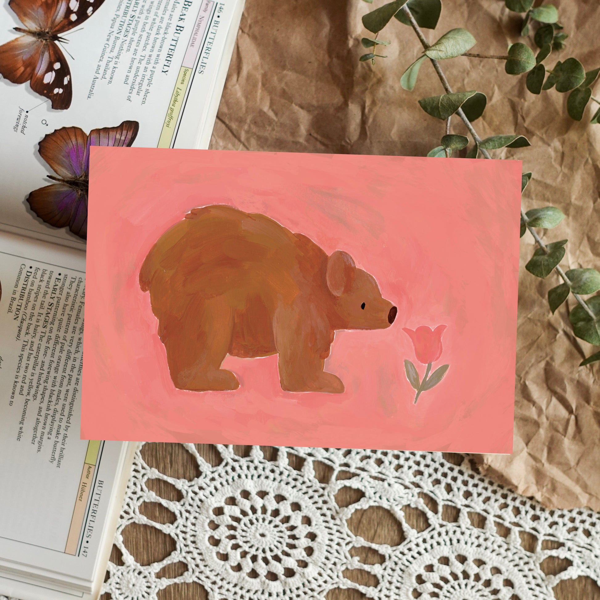 A brown bear sniffing a sweet little pink tulip on a painted pink background.