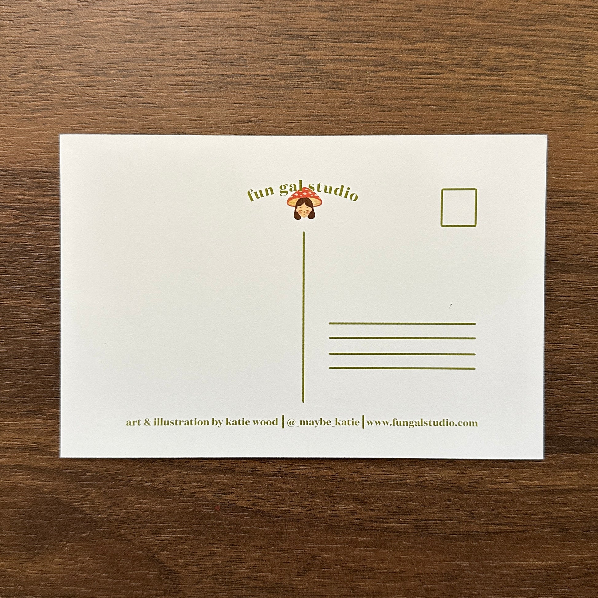 The front of each matte-coated, 4x6" postcard features an illustrated design, which can either be used as wall art or mailed—the back is uncoated for writing on and has space for a message, address, and stamp.