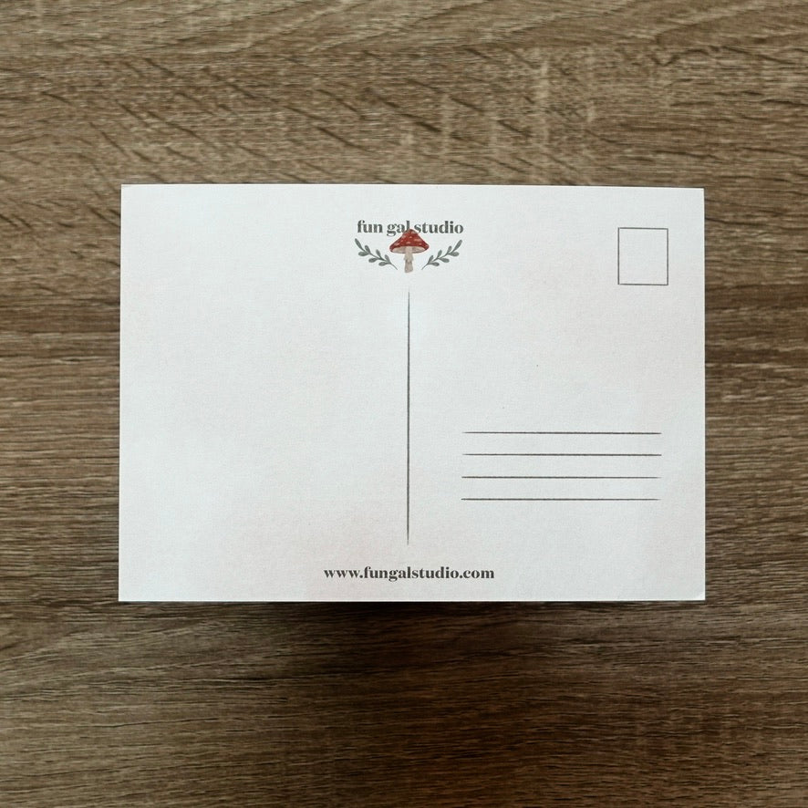 The front of each matte-coated, 4x6" postcard features an illustrated design, which can either be used as wall art or mailed—the back is uncoated for writing on and has space for a message, address, and stamp.